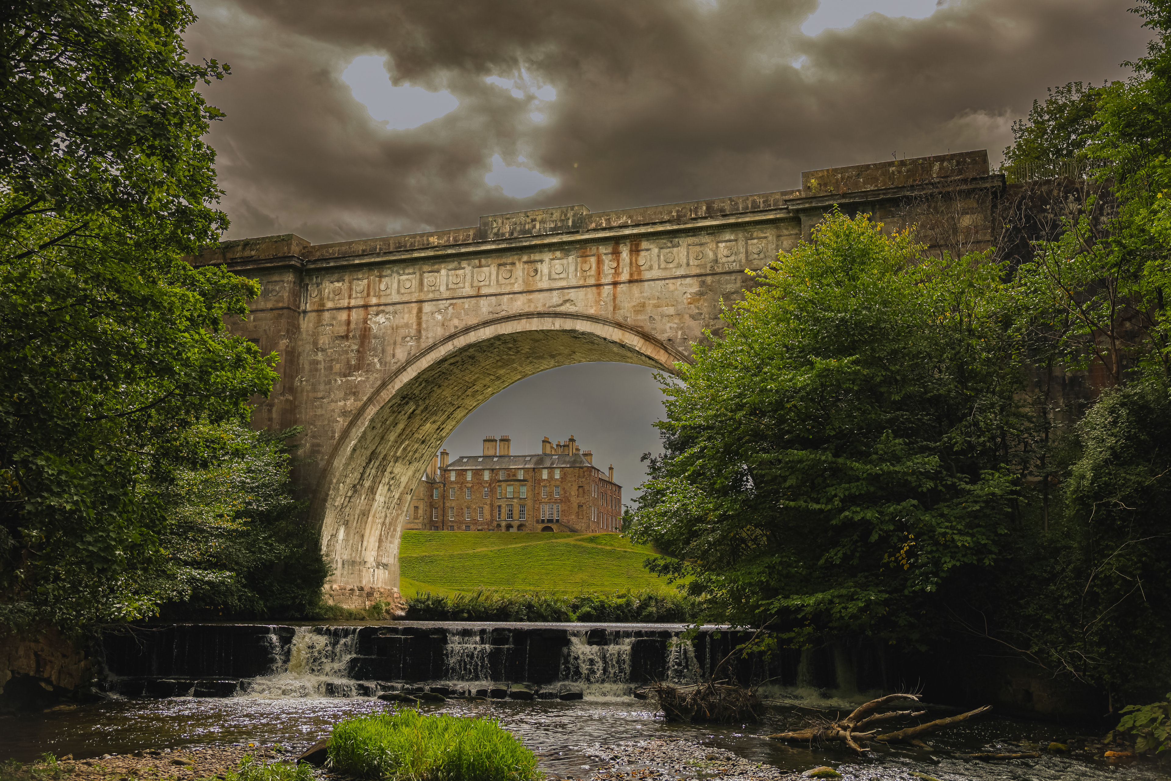 Dalkeith Palace by the banks of the River North Esk with Montagu Bridge in the foreground.